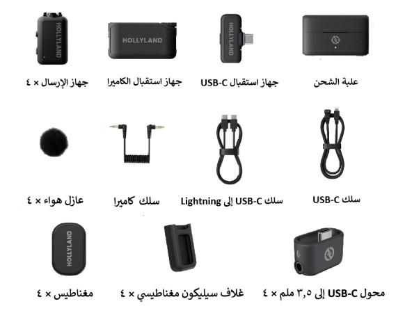 <p>4-Person Interviews, Videos, Streaming Camera-Mount and USB-C Receivers 4 Compact Clip-On Transmitters with Mics 32-Bit Float Recorders on Transmitters Supports Wireless Audio Monitoring 48 kHz/32-Bit Audio, 128 dB SPL Noise Cancellation, Auto Gain Control Timecode Generator 11-Hour Battery/36-Hour with Charge Case Charging Case, Magnets, Windscreens المحتويات: 4 × جهاز إرسال 1 × مستقبل كاميرا 1 × مستقبل USB-C 1 × حافظة شحن كيبل تي ار اس 3.5 ملم إلى 3.5 ملم تي ار اس × 1 + كيبل USB-C إلى لايتنينج × 1 + كيبل USB-C إلى USB-C × 1</p>